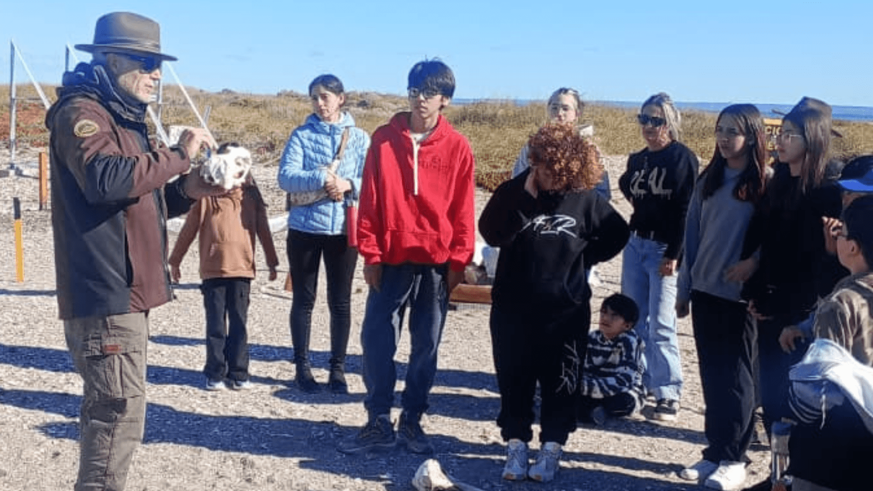 Guardas Ambientales de la Secretaría de Ambiente y Cambio Climático de Río Negro acompañó a estudiantes de la Escuela 360 “Mario Armando Toconás” de Playas Doradas en una serie de actividades enmarcadas en el proyecto de educación ambiental “Guardianes del Mar”. La propuesta busca fortalecer el vínculo de niñas, niños y jóvenes con la biodiversidad marina y promover la conciencia sobre la importancia de su cuidado.